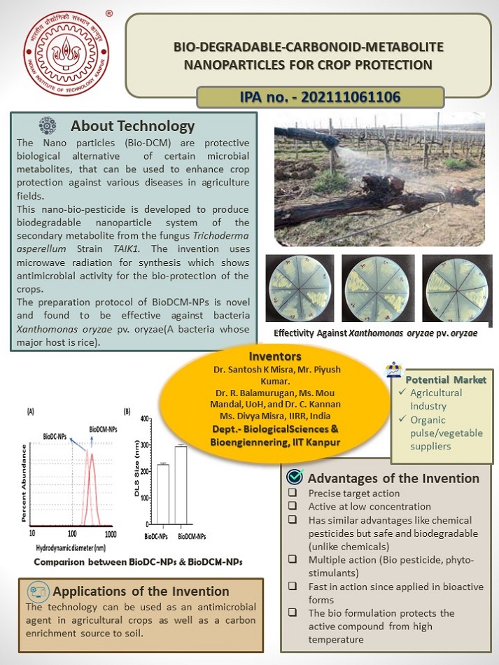 A team of researchers led by Dr. Santosh K Misra, and Mr. Piyush Kumar from the Department of Biological Sciences & Bioengineering has developed a Novel Nanoparticle-based Bio-Degradable-Carbonoid-Metabolite (BioDCM) that can protect agricultural crops from fungal and bacterial infections, in collaboration with researchers Dr. C. Kannan and Ms. Divya Mishra from ICAR-Indian Institute of Rice Research, and Dr. R Balamurugan and Ms. Mou Mandal from the School of Chemistry, University of Hyderabad.