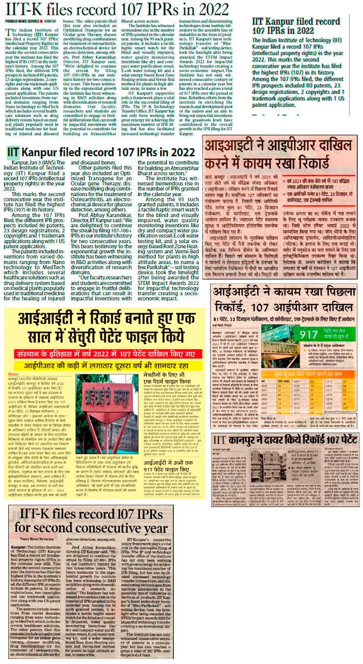 2 | 5 Jan 23 | IIT-K files record 107 IPRS for second consecutive year | Times Of India | Kanpur | 2 | Correspondent |