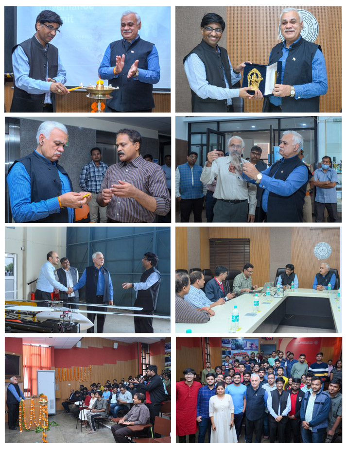As part of the inauguration of the Summit, Shri Durga Shanker Mishra visited the C3i Hub, Centre of Excellence for Drones, and National Centre for Flexible Electronics at IIT Kanpur. At C3i Hub, he was shown the blockchain technology developed at IIT Kanpur for e-Governance, and the techniques developed to address security vulnerabilities. As part of the National Blockchain Project, IIT Kanpur has tie-ups with UP and Karnataka state governments for e-Governance services. At Centre of Excellence for Drones, Prof. Abhishek from the Dept. of Aerospace Engineering, IIT Kanpur showcased the Chief Guest the endurance, altitude and load capacity of drones, along with fuel cell development for drones. He was also shown the drones used for vaccine and essentials deliveries during COVID.