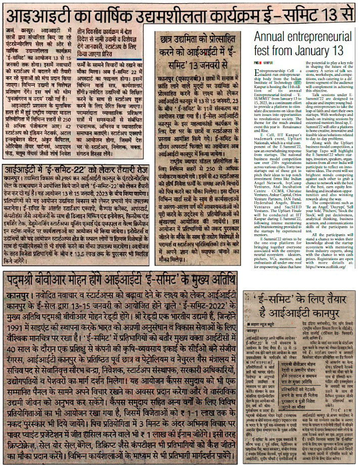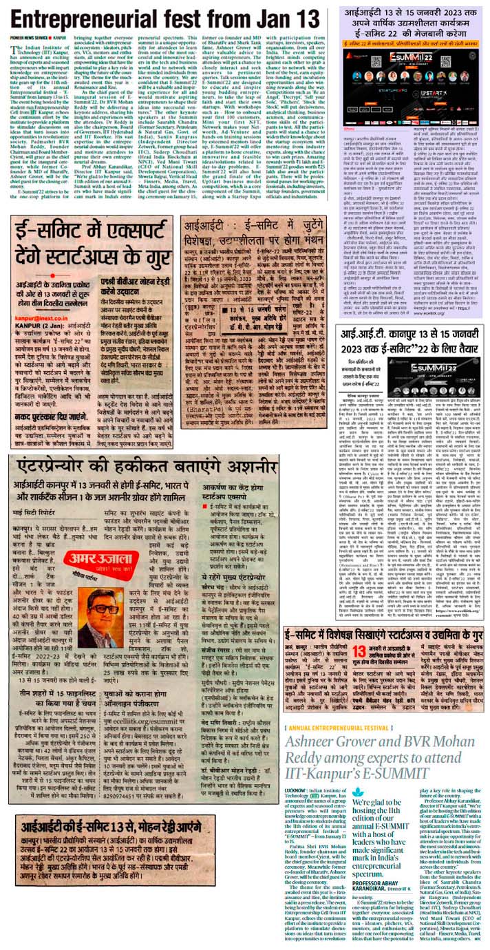 11 | 9 Jan 23 | Ashneer Grover and BVR Mohan Reddy among experts to attend IIT-Kanpur's E-SUMMIT | Online Web | NA | HT Lucknow | |