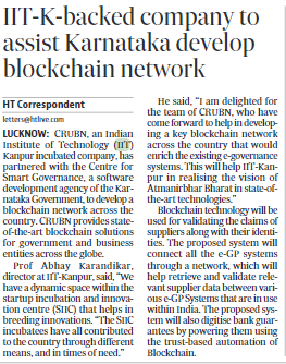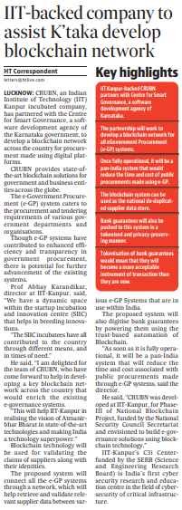 CRUBN, an Indian Institute of Technology (IIT) Kanpur incubated company, has partnered with the Centre for Smart Governance, a software development agency of the Karnataka Government to develop a blockchain network across the country.