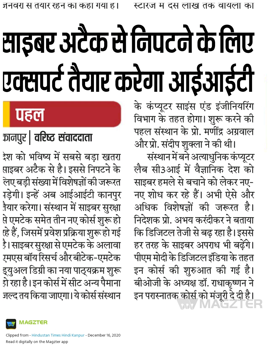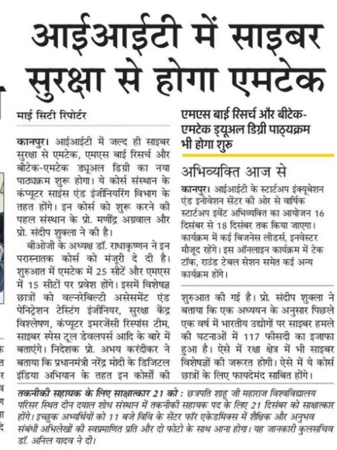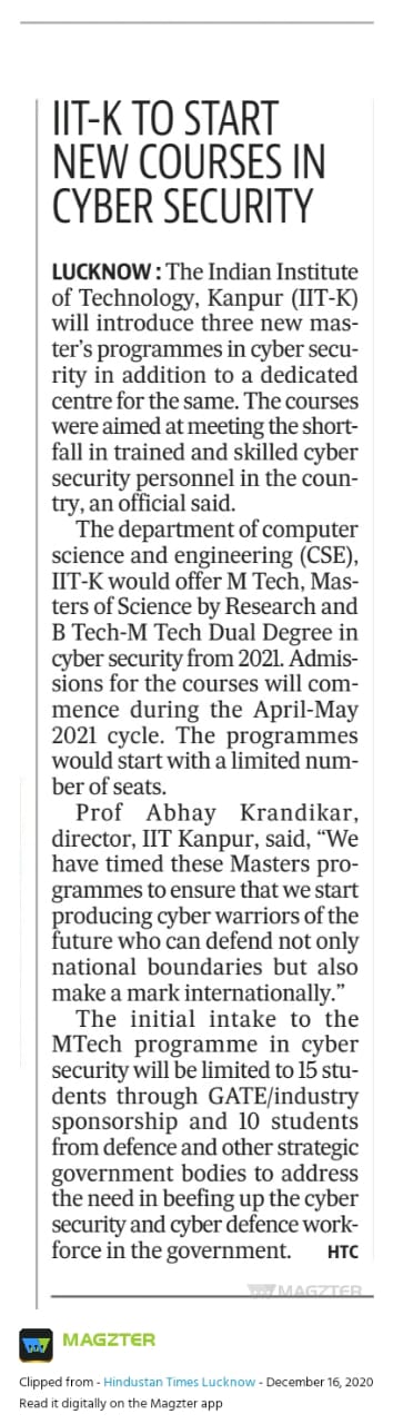 Kanpur (UP), Dec 15 (PTI) With a view to meet the shortfall in trained and skilled cybersecurity personnel in the country, the Indian Institute of Technology, Kanpur has decided to introduce three new master''s programs in cybersecurity in addition to a dedicated centre for the discipline.