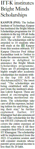 IIT Kanpur has instituted the Bright Minds Scholarships programme for 10 students within the top 100 all India rankings of JEE Advanced 2021.
