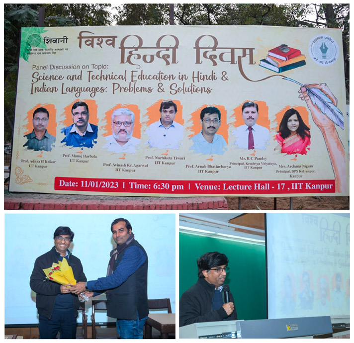 दिनांक 11 जनवरी 2023 को आई आई टी कानपुर के राजभाषा प्रकोष्ठ एवं शिवानी केन्द्र के संयुक्त तत्वाधान में ‘अंतर्राष्ट्रीय हिन्दी दिवस’ के उपलक्ष्य में “विज्ञान तथा प्रौद्योगिकी शिक्षा को हिन्दी एवं अन्य भारतीय भाषाओं में उपलब्ध कराने में आने वाली कठिनाइयाँ एवं उनका समाधान” विषय पर एक परिचर्चा का आयोजन किया गया । इस परिचर्चा का उद्घाटन मुख्य अतिथि एवं संस्थान के निदेशक प्रोफ़ेसर अभय करंदीकर जी द्वारा किया गया। इस परिचर्चा में इस संस्थान के प्रोफ़ेसर अदित्य एच केलकर, प्रोफ़ेसर मनोज हरबोला, प्रोफ़ेसर अविनाश कुमार अग्रवाल, प्रोफ़ेसर नचिकेता तिवारी, प्रोफ़ेसर अर्नब भट्टाचार्या तथा केन्द्रीय विद्यालय आई आई टी कानपुर के प्रधानाचार्य श्री आर सी पाण्डेय एवं दिल्ली पब्लिक स्कूल कल्याणपुर की प्रधानाचार्या श्रीमती अर्चना निगम जी ने भाग लिया।